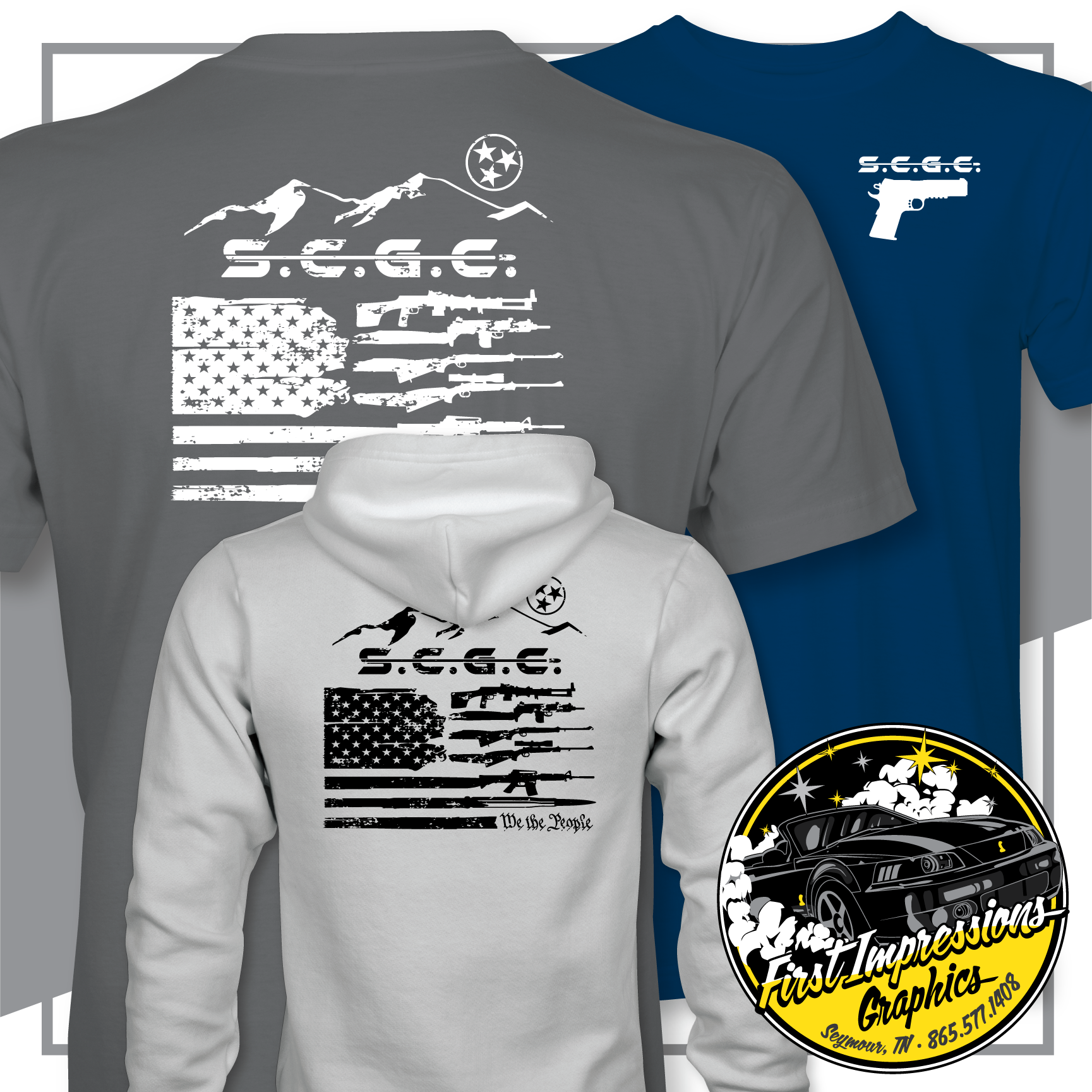 - Back Graphic: A large, striking image featuring the S.C.G.C. initials, the Tennessee mountain range, the state's tri-star symbol, and an American flag silhouette composed of various firearms, plus the phrase "We the People".